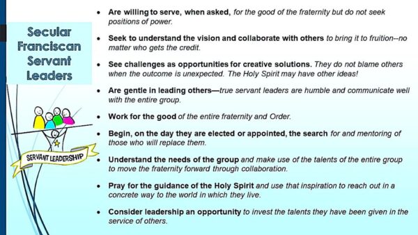 El Manual para el liderazgo de servicio, publicado por OFS-USA en 2010, contiene una gran cantidad de información que puede guiarnos para ser o convertirnos en excelentes líderes servidores. Esta semana nos inspiramos en nuestros modelos: Jesús, Francisco y Clara. (Ver Manual para el Liderazgo de Servicio Franciscano Seglar, págs. 4-7 en inglés)