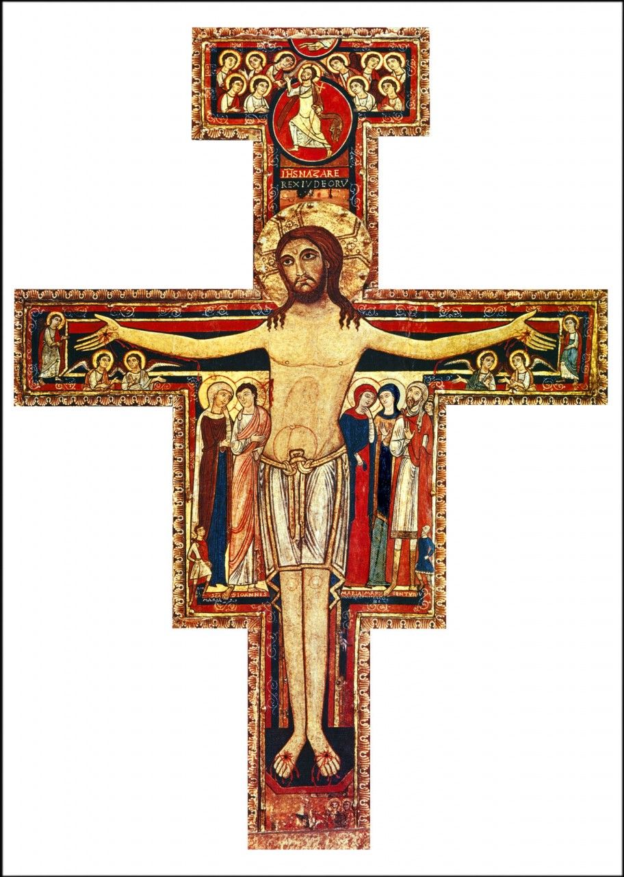 As we actually look upon a picture of the San Damiano crucifix, we see more of a glorified Christ than we do of a suffering Christ. We also notice many other persons included in the picture.